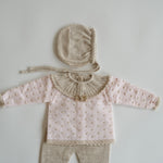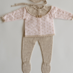 Verwelkom de herfst en winter met warmte en stijl met ons Baby setje & Muts, een onmisbare toevoeging aan de garderobe van jouw kleintje. Dit 3-delige setje in een prachtige roze/taup kleur is ontworpen om je baby comfortabel te houden tijdens koudere seizoenen, maar is veelzijdig genoeg om het hele jaar door te dragen.Het Baby setje is handgemaakt dus met liefde gemaakt.